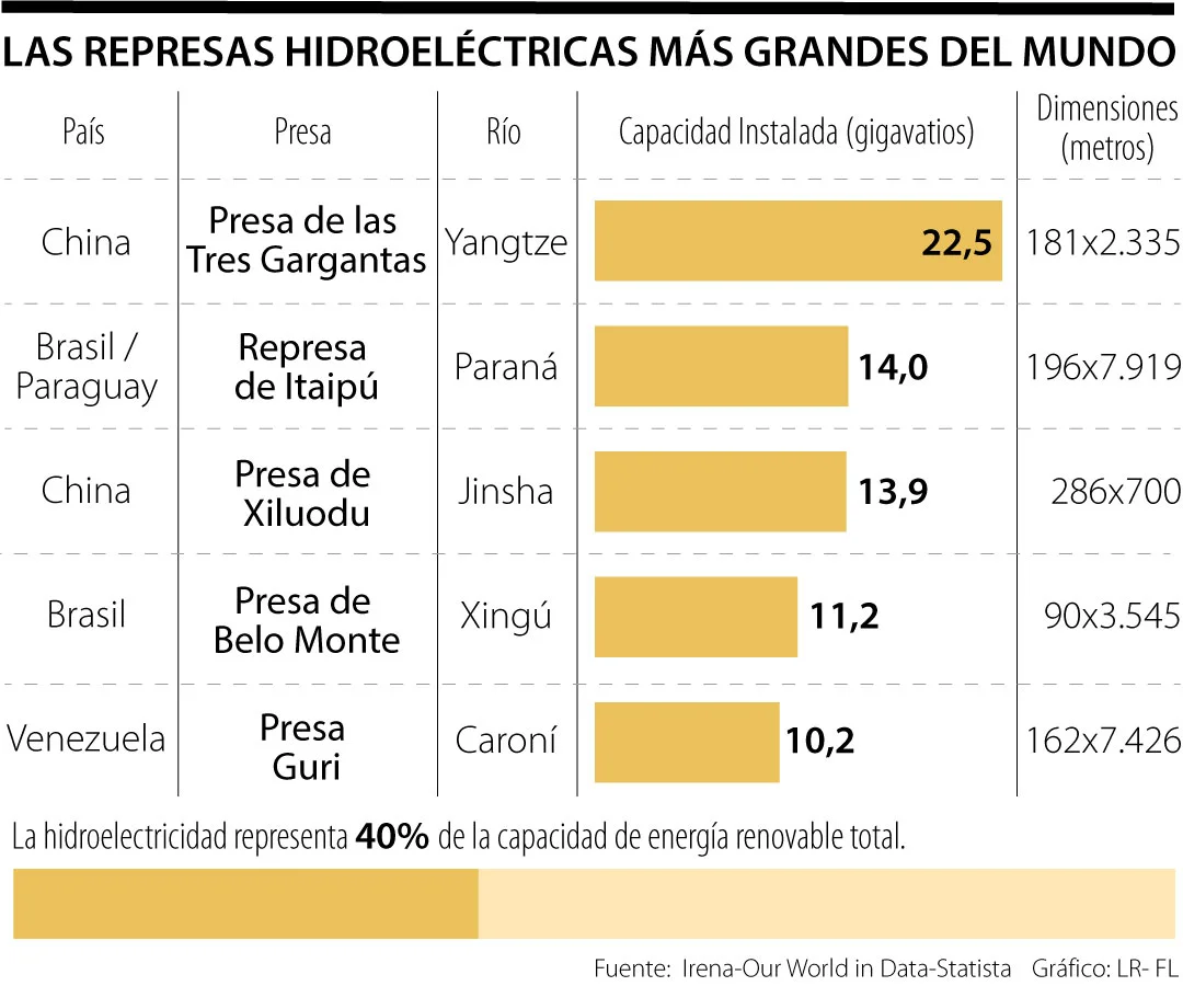De acuerdo con datos de la Organización Latinoaméricana de Energía y la Agencia Internacional de Energías Renovables, tres de las cuatro centrales más grandes del mundo están en América Latina. La mayor de la región es la represa de Itaipú que está ubicada entre Paraguay y Brasil, sobre el río Paraná, con una capacidad de 14 gigavatios.
